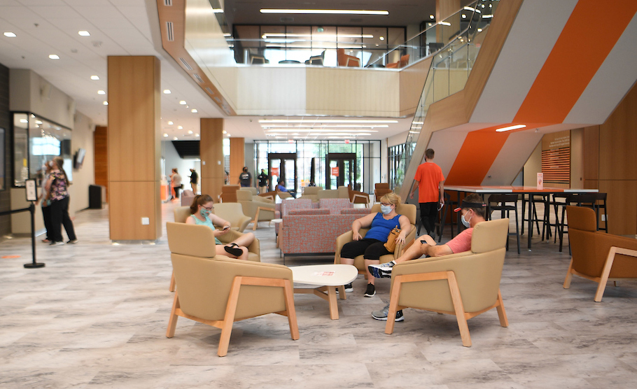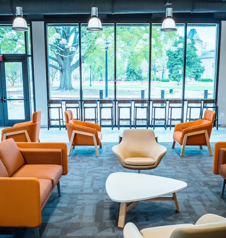 Throughout the building, there are lively open spaces where students can relax and settle in for individual or small group activities while overlooking Academic Circle.