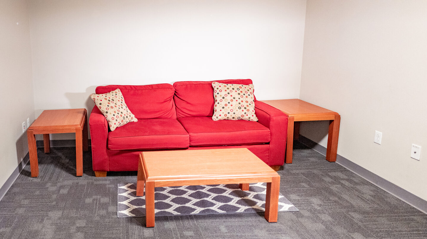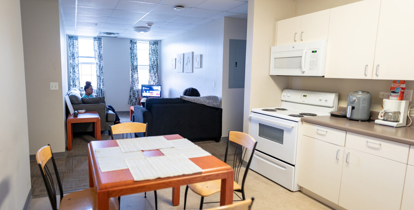 - Offers a shared kitchenette space with a sink and counter space. There is space available for a mini refrigerator and space for a microwave but neither are provided by the university.
