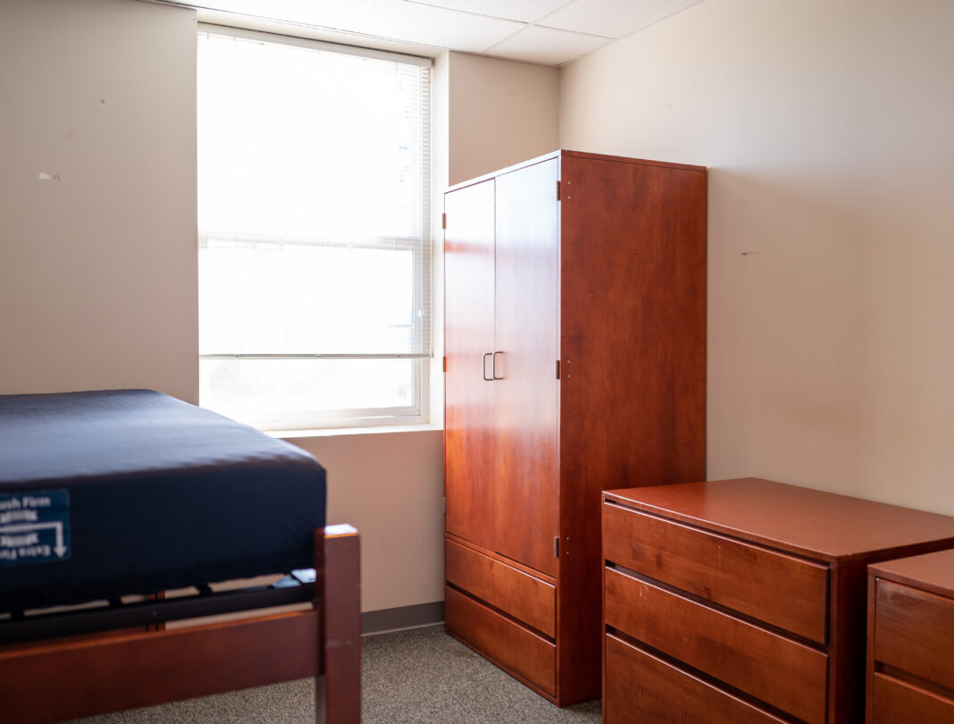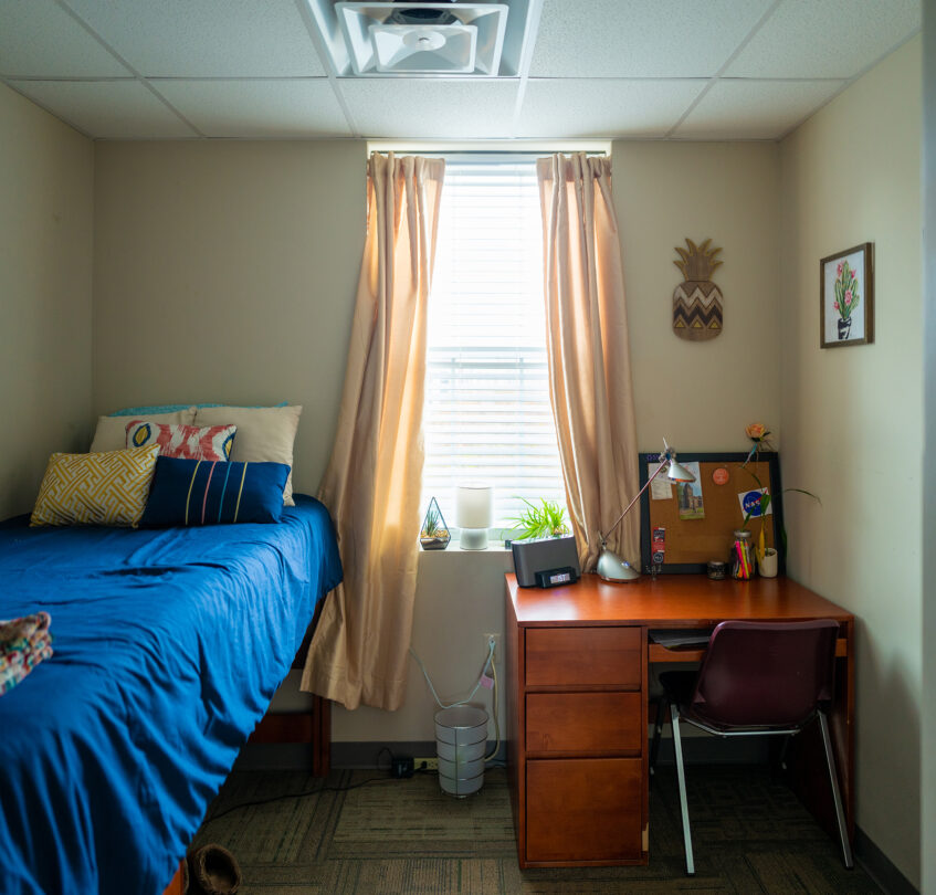 - Four fully furnished private bedrooms with a twin extra-long bed, a dresser, closet space, and a desk