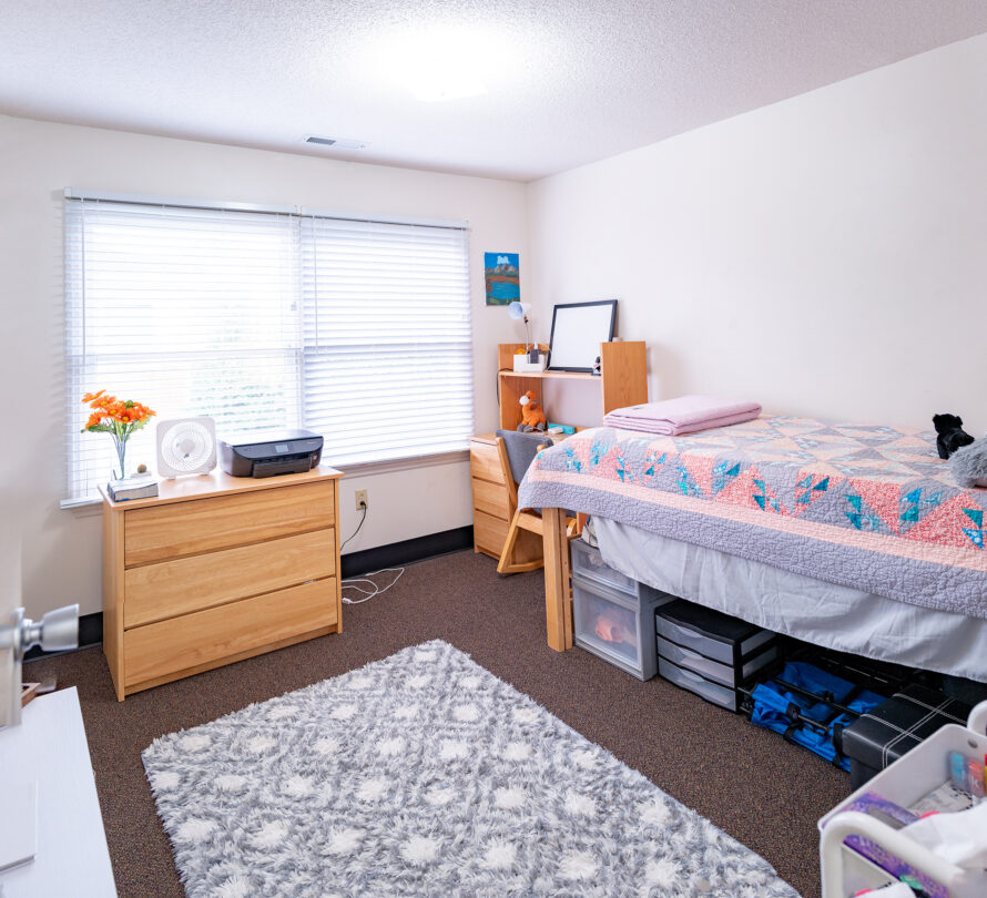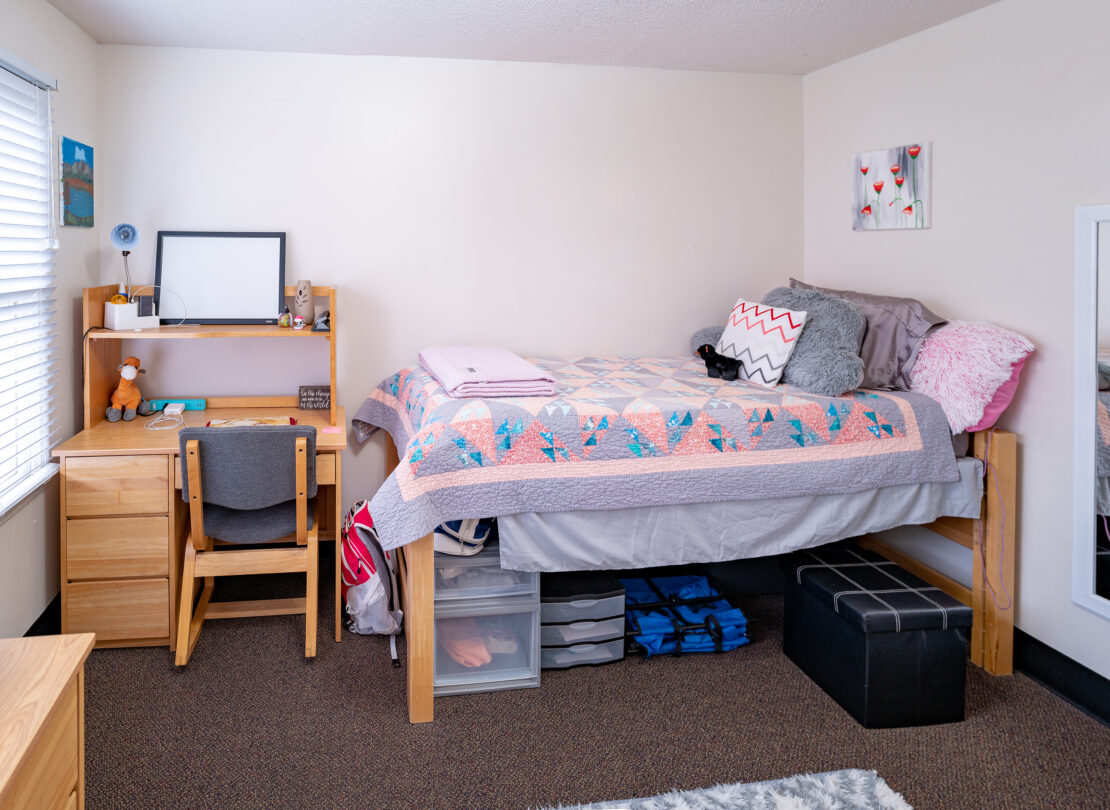 - Three fully furnished private bedrooms with a twin extra-long bed, a dresser, closet space, and a desk.