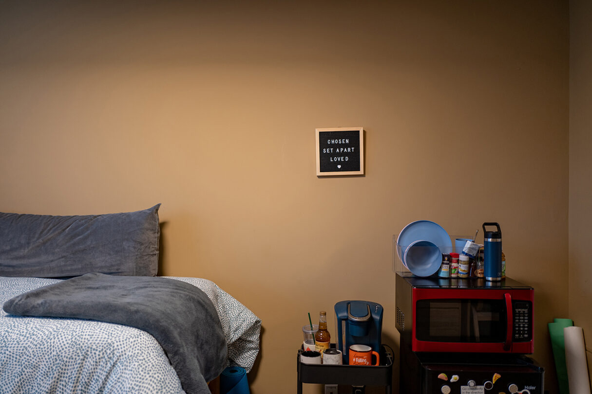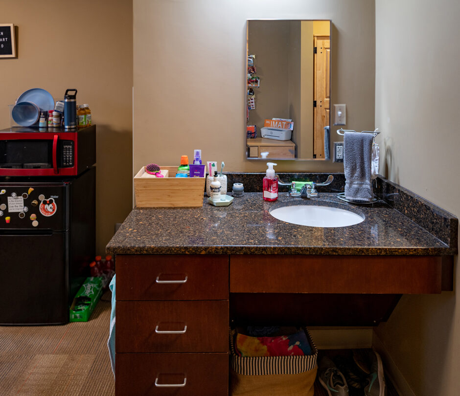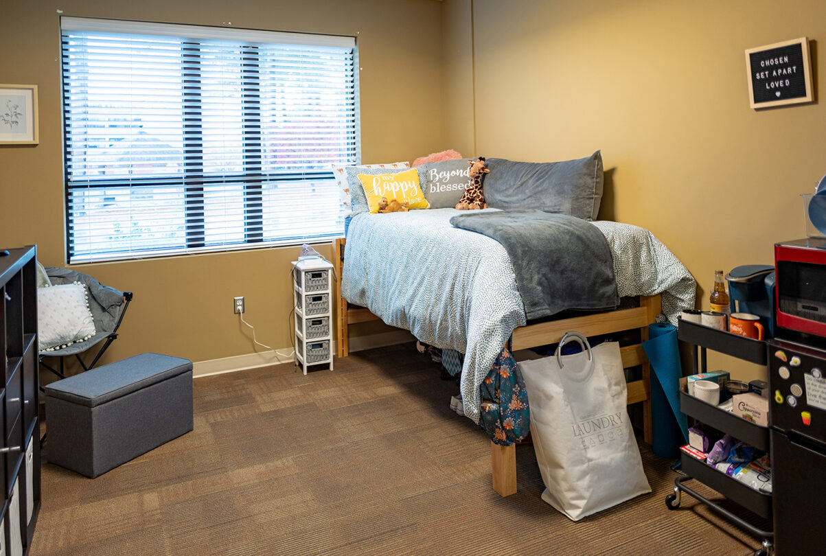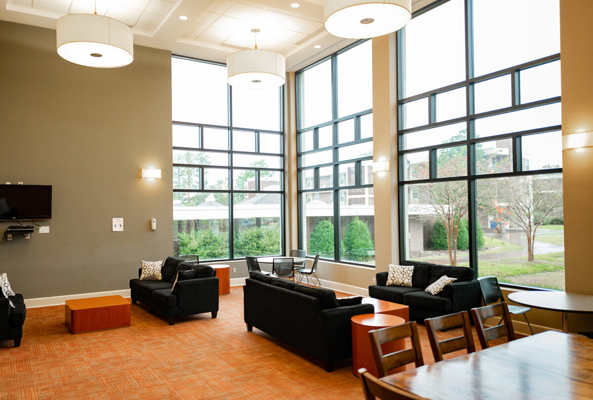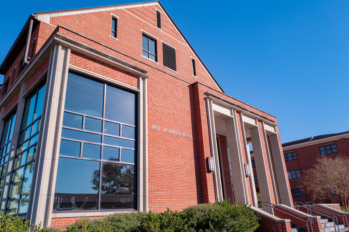 Pat Barker Hall, situated on the north campus, houses 146 students. The three-story brick structure consists of 4-person suites, with each room housing 2 students and a shared bathroom. Each floor contains shared lounges and study areas with great views to the surrounding campus. The ground floor contains a gallery entrance and a large commons area.