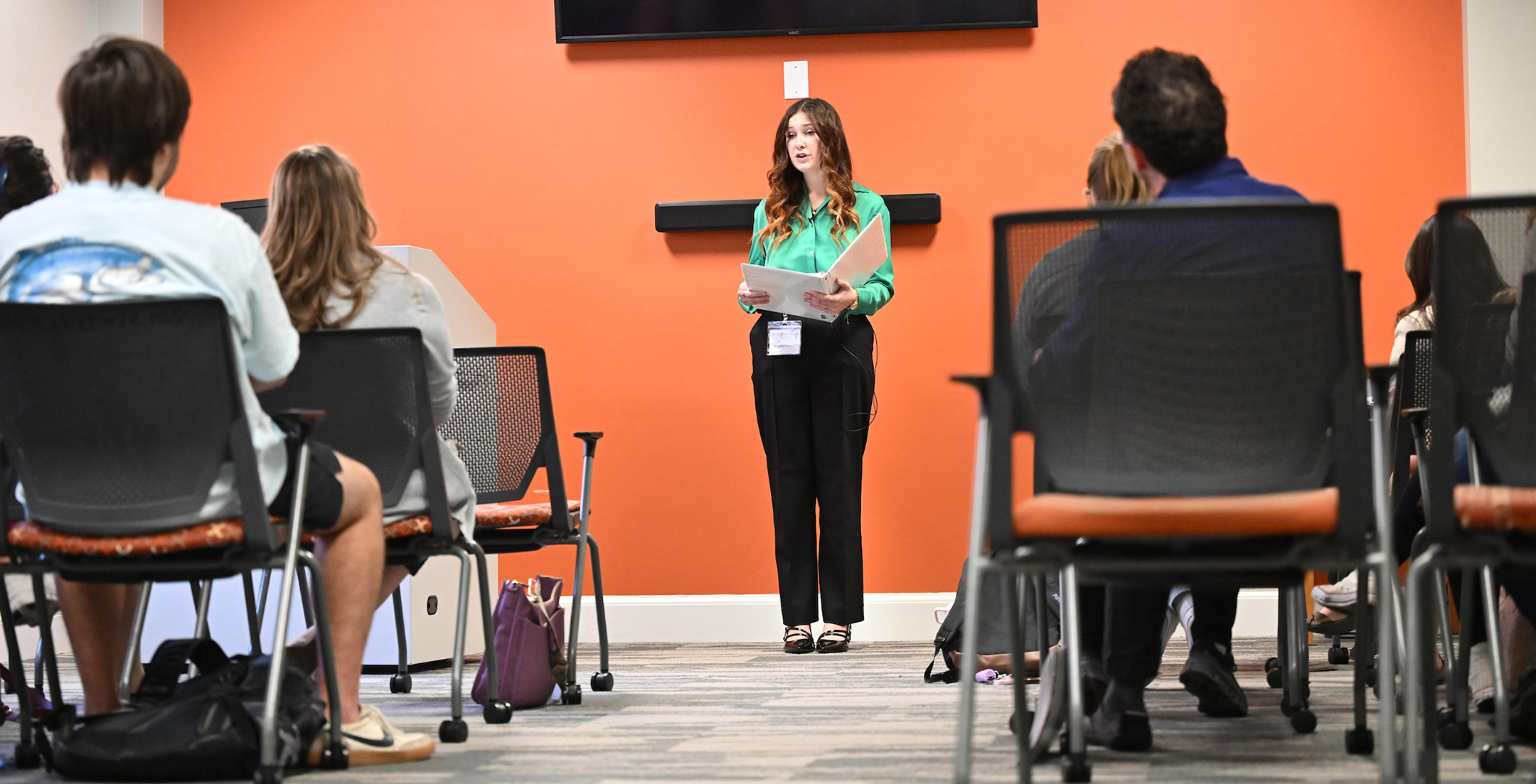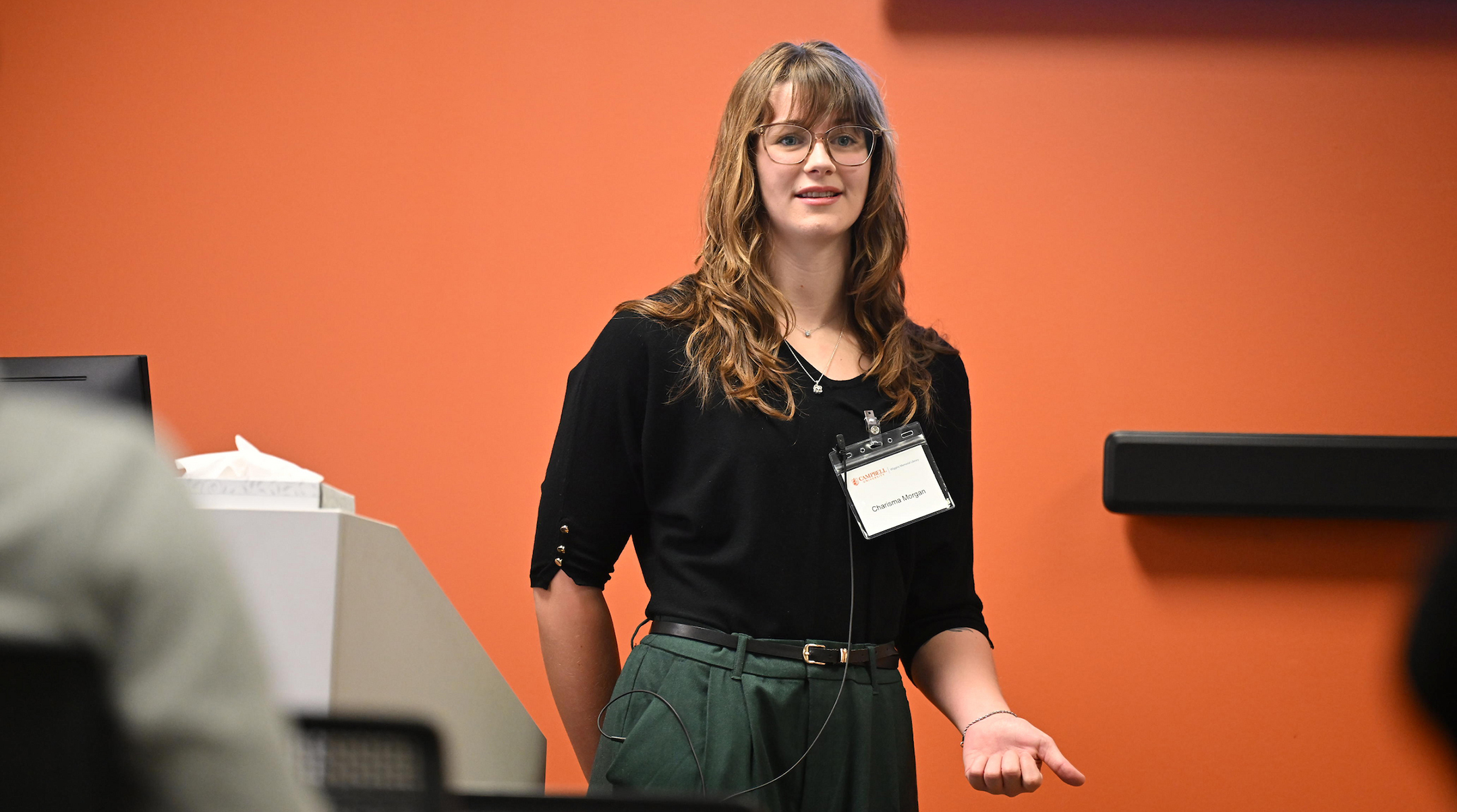 Mental health was a common theme among the oral presentations Tuesday morning on the third floor of Wiggins Memorial Library. Psychology major and Army veteran Shane Roles presented on mental health stigma and how individuals and organizations can overcome biases and stereotypes to find support for themselves or colleagues who may be struggling. Madelyn Converse performed a study on her classmates to find if growing up with divorced parents affected their academic performance and resilience levels in college. And Kayla Lucas looked at societal standards of beauty and how those standards can affect adolescent mental health and self esteem.