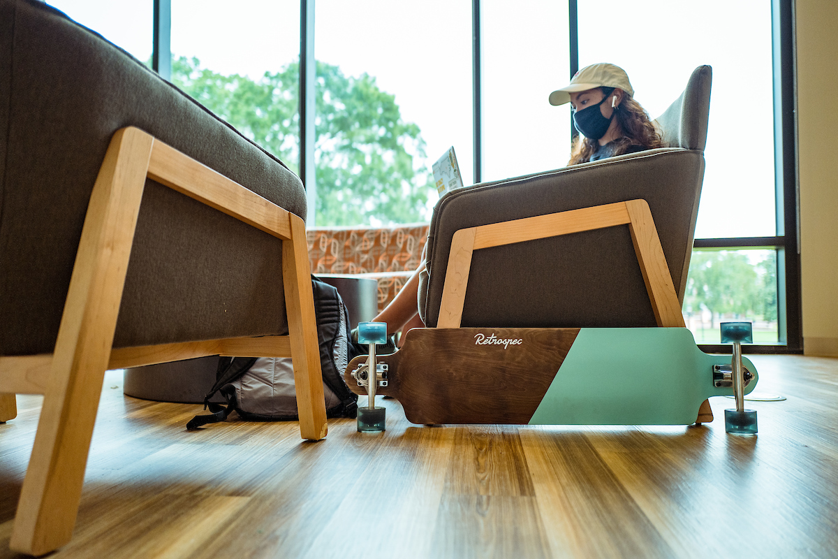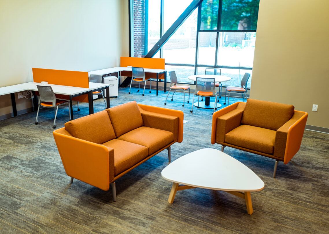 Throughout the building, there are lively open spaces where students can relax and settle in for individual or small group activities while overlooking Academic Circle.