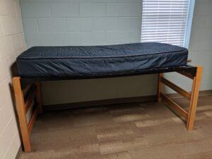 On move in day all beds will be in a raised position. This is the most popular option and is requested by most students. There is space to store drawers, containers or a 3.5 cubic feet refrigerator. Ten days after classes have began in the semester a work order request can be submitted for the bed to be lowered. Students may not bring personal lofts.