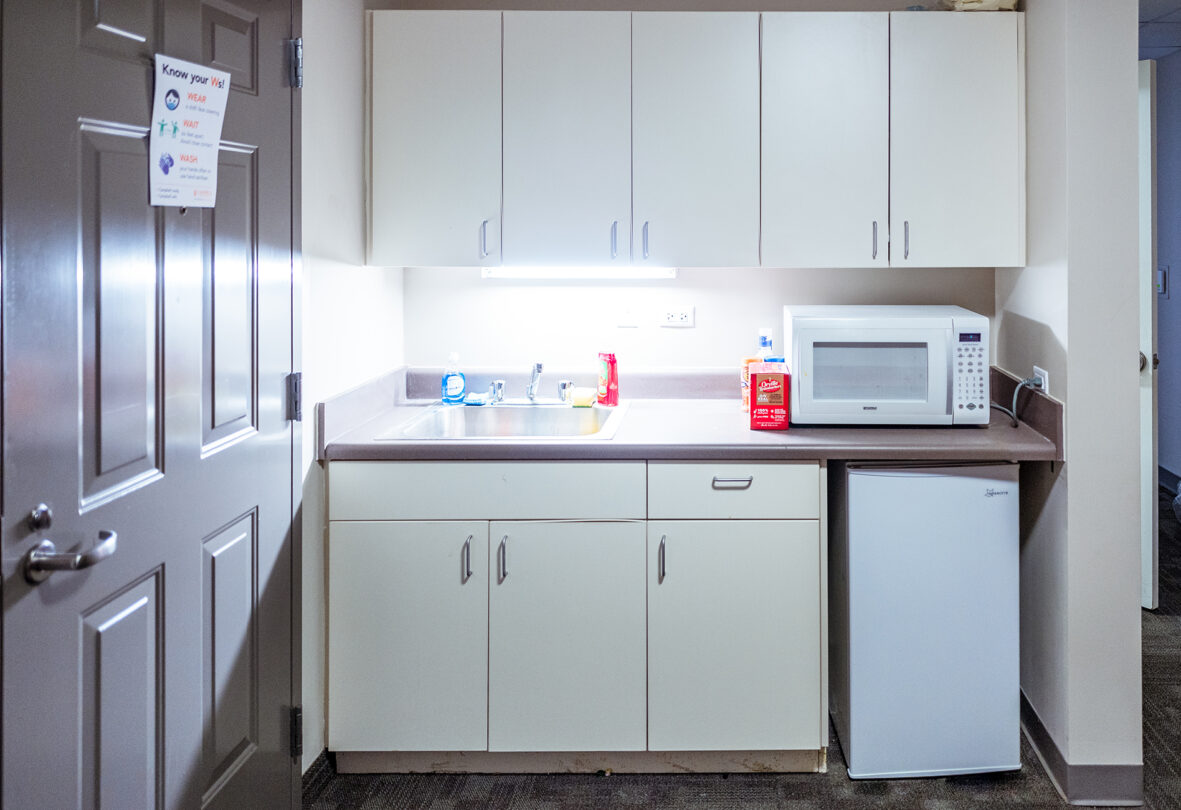 - Offers a shared kitchenette space with a sink and counter space. There is space available for a mini refrigerator and space for a microwave but neither are provided by the university.