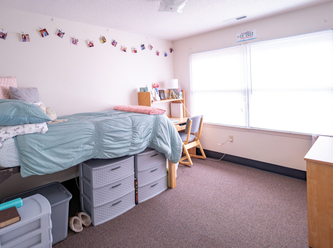 - Three fully furnished private bedrooms with a twin extra-long bed, a dresser, closet space, and a desk.