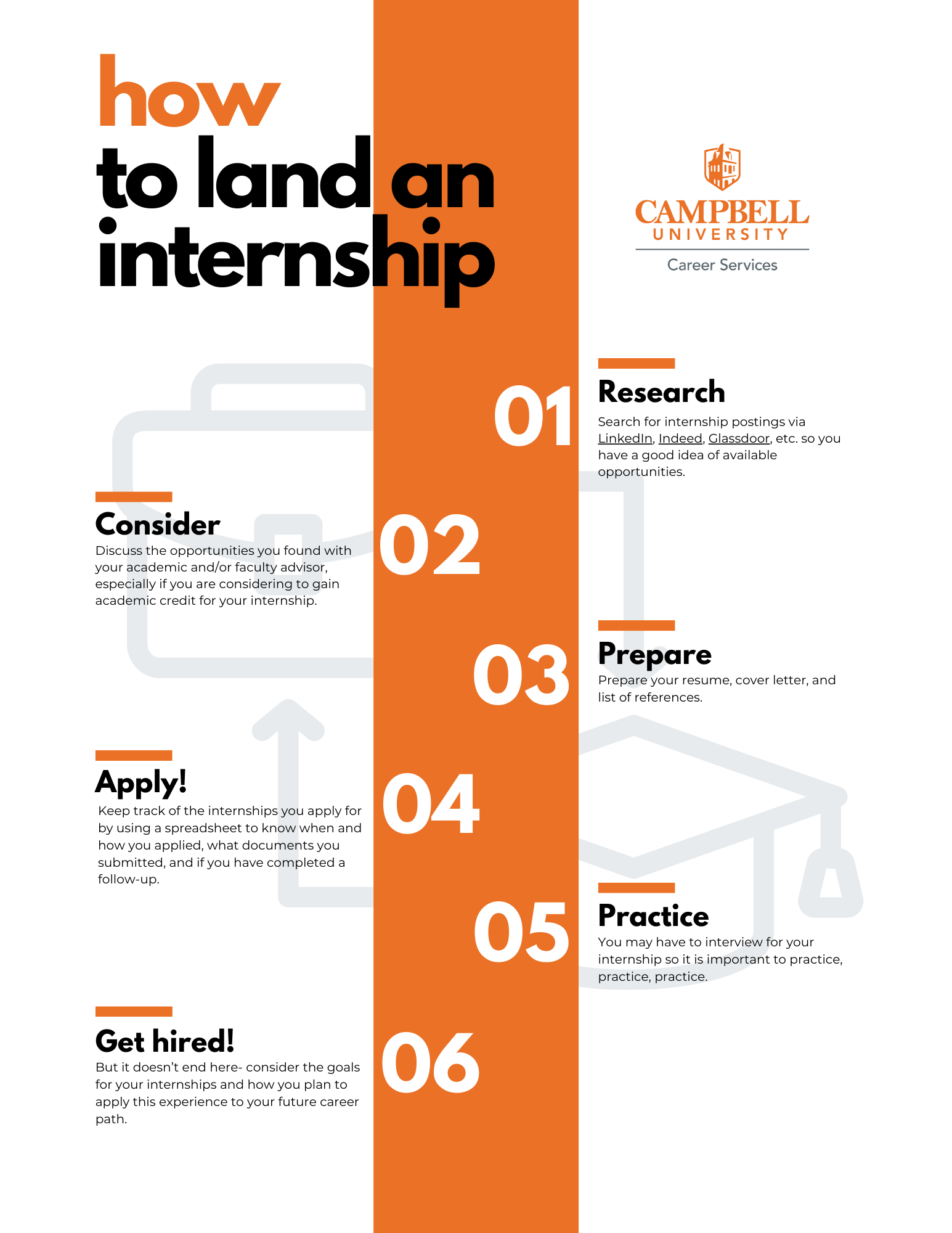 - Search for internship postings via LinkedIn, Indeed, Glassdoor, etc. so you have a good idea of available opportunities.