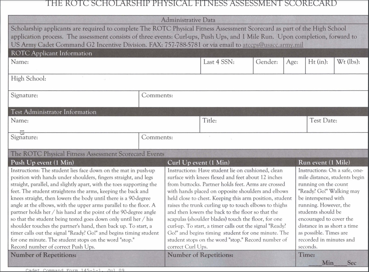 - Submit High School transcripts, ACT or SAT scores, and ROTC Physical Fitness Assessment results to U.S. Army Cadet Command.